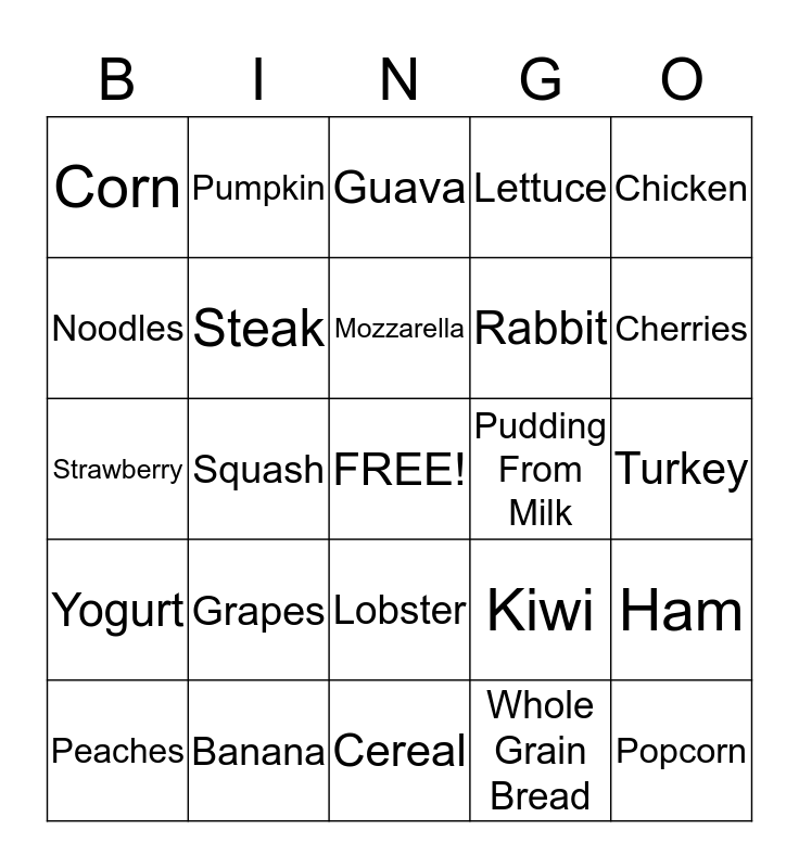 This bingo card has a free space and 24 words: Grapes, Banana, Mozzarella, Peaches, Chicken, Corn, Noodles, Pumpkin, Pudding From Milk, Lobster, Rabbit, Strawberry, Kiwi, Ham, Steak, Whole Grain Bread, Turkey, Guava, Cherries, Squash, Popcorn, Yogurt, Lettuce and Cereal.