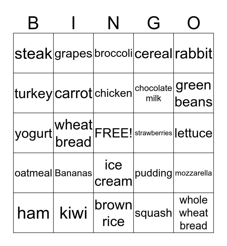 This bingo card has a free space and 24 words: Bananas, kiwi, chicken, ham, rabbit, steak, turkey, grapes, strawberries, ice cream, chocolate milk, yogurt, pudding, mozzarella, carrot, squash, lettuce, broccoli, green beans, wheat bread, whole wheat bread, oatmeal, cereal and brown rice.