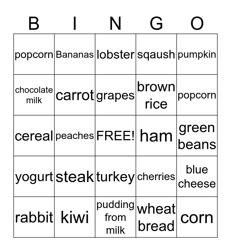 This bingo card has a free space and 24 words: steak, kiwi, grapes, rabbit, pumpkin, popcorn, chocolate milk, Bananas, ham, turkey, brown rice, cereal, cherries, blue cheese, carrot, wheat bread, green beans, lobster, popcorn, peaches, corn, yogurt, sqaush and pudding from milk.
