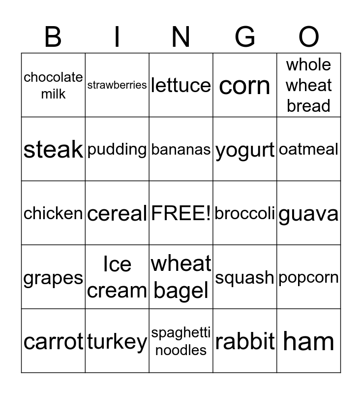 This bingo card has a free space and 24 words: Ice cream, turkey, bananas, carrot, whole wheat bread, chocolate milk, steak, strawberries, broccoli, wheat bagel, yogurt, chicken, squash, popcorn, pudding, rabbit, guava, lettuce, oatmeal, cereal, ham, grapes, corn and spaghetti noodles.