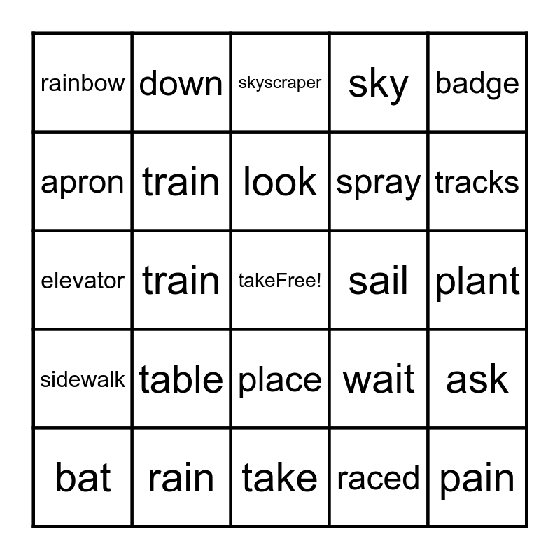 This bingo card has a free space and 29 words: bat, bait, train, garden, rainbow, skyscraper, train, table, sail, rain, plant, pain, take, raced, tracks, glass, place, sidewalk, badge, elevator, wait, three, spray, apron, sky, down, ask, look and downtown.