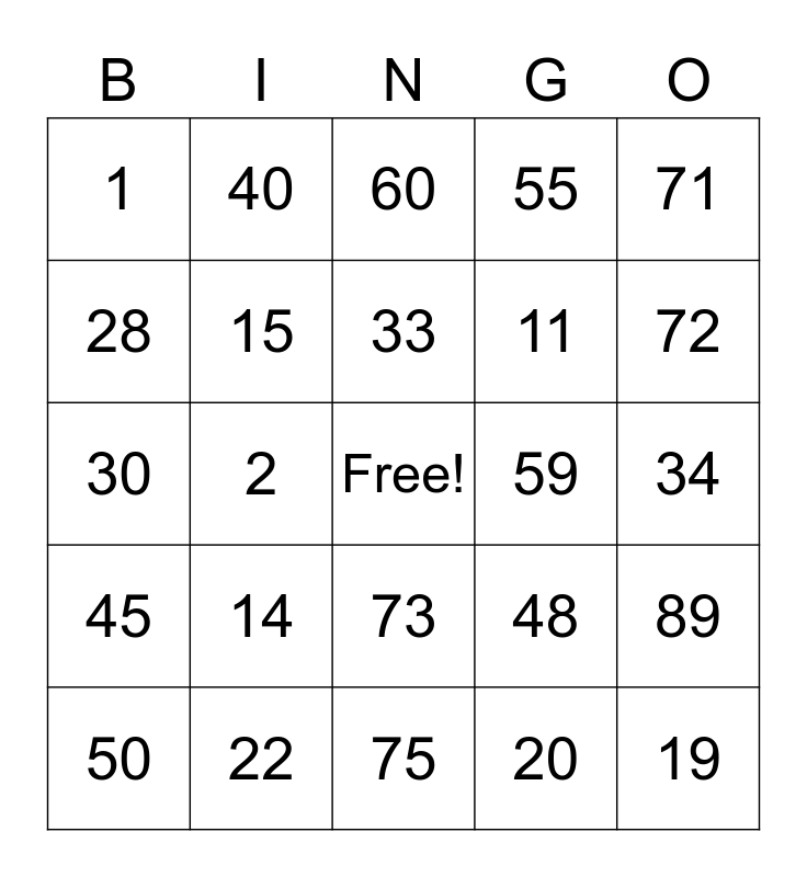 This bingo card has a free space and 24 words: 14, 22, 33, 50, 71, 1, 28, 40, 59, 73, 11, 30, 48, 89, 15, 20, 34, 60, 72, 2, 19, 45, 55 and 75.