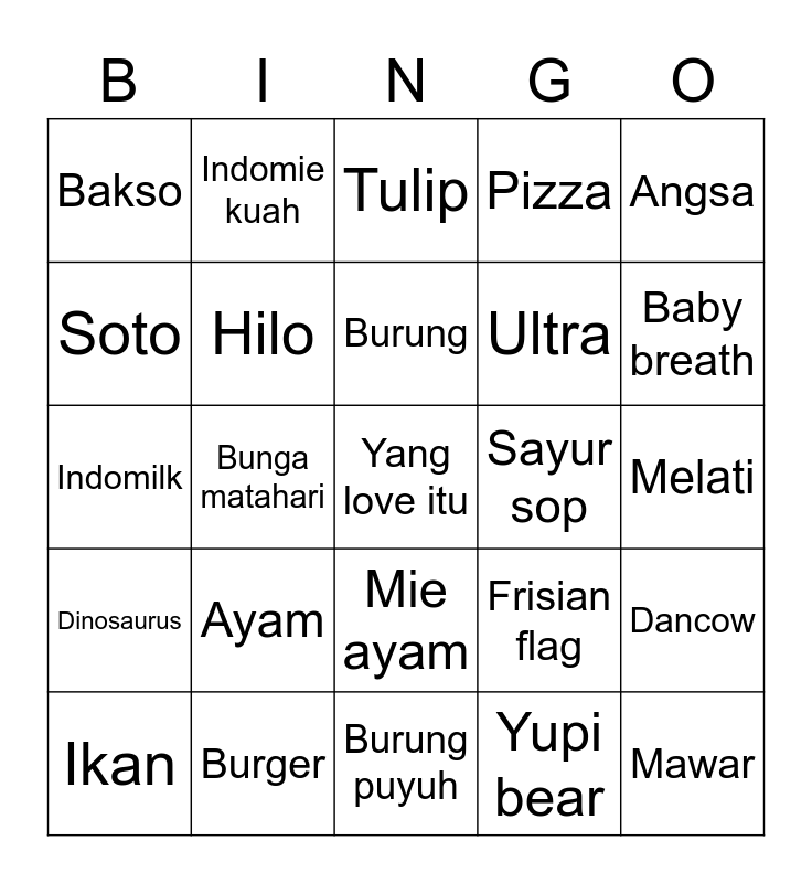This bingo card has 25 words: Ayam, Burung puyuh, Burung, Ikan, Angsa, Bakso, Soto, Indomie kuah, Sayur sop, Mie ayam, Ultra, Indomilk, Frisian flag, Dancow, Hilo, Mawar, Melati, Tulip, Baby breath, Bunga matahari, Yang love itu, Burger, Dinosaurus, Pizza and Yupi bear.
