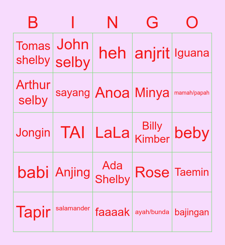 This bingo card has a free space and 24 words: Anjing, salamander, Anoa, Tapir, Iguana, Tomas shelby, Arthur selby, John selby, Billy Kimber, Ada Shelby, Minya, Jongin, Rose, Taemin, sayang, ayah/bunda, beby, heh, mamah/papah, TAI, bajingan, babi, anjrit and faaaak.