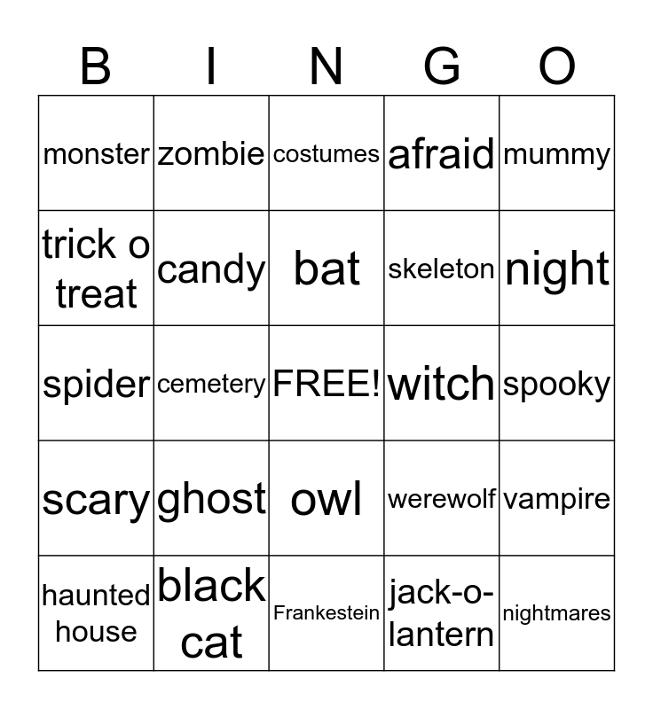 This bingo card has a free space and 24 words: ghost, black cat, bat, haunted house, mummy, monster, trick o treat, zombie, witch, owl, skeleton, spider, werewolf, vampire, candy, jack-o-lantern, spooky, costumes, night, cemetery, nightmares, scary, afraid and Frankestein.
