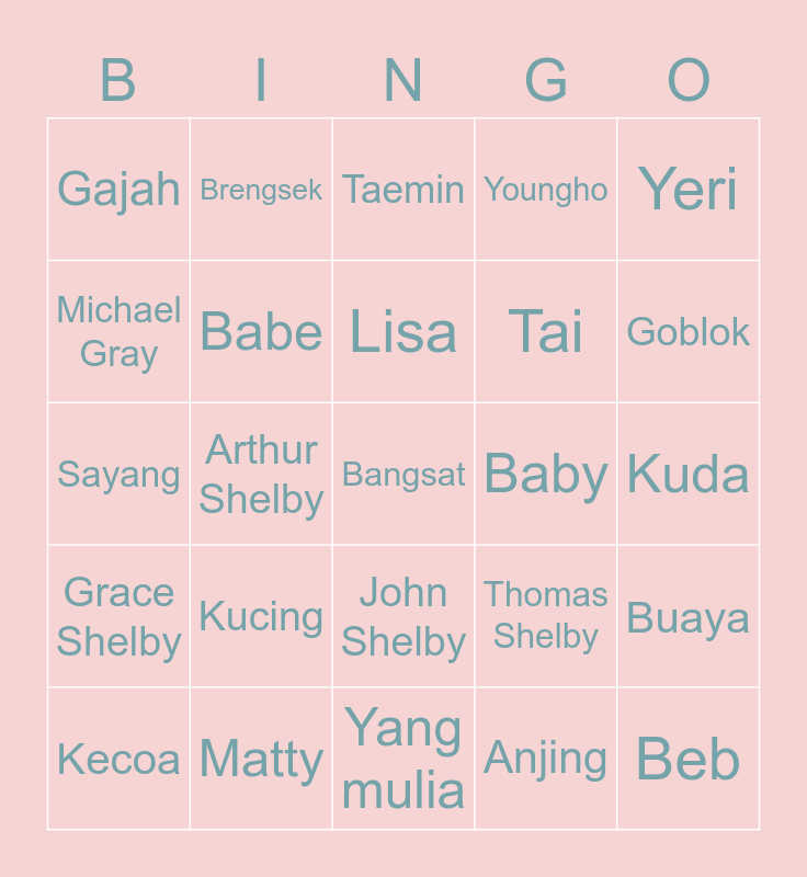 This bingo card has 25 words: Kucing, Yang mulia, Lisa, Kecoa, Yeri, Gajah, Michael Gray, Brengsek, Baby, John Shelby, Tai, Sayang, Thomas Shelby, Buaya, Babe, Beb, Kuda, Taemin, Goblok, Arthur Shelby, Bangsat, Matty, Grace Shelby, Youngho and Anjing.