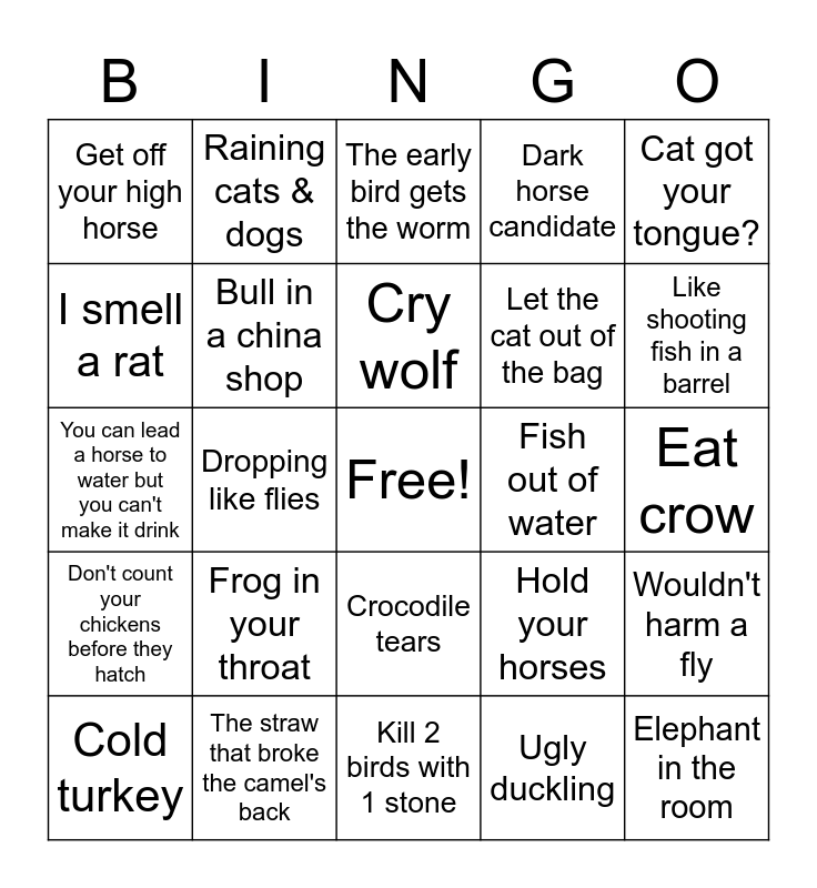 This bingo card has a free space and 39 words: Busy as a bee, Beating a dead horse, Birds of a feather flock together, Bull in a china shop, Cold turkey, Crocodile tears, Cry wolf, Curiosity killed the cat, Cat got your tongue?, Don't count your chickens before they hatch, Dropping like flies, Dark horse candidate, Elephant in the room, Eat crow, Fish out of water, Frog in your throat, Going down the rabbit hole, Get off your high horse, Happy as a clam, Hold your horses, I smell a rat, Kill 2 birds with 1 stone, Let the cat out of the bag, Like shooting fish in a barrel, Like a chicken with its head cut off, Monkey see, monkey do, No spring chicken, Open a can of worms, Playing possum, Raining cats & dogs, Scaredy cat, Sitting duck, The early bird gets the worm, The straw that broke the camel's back, Ugly duckling, Wild goose chase, Wouldn't harm a fly, You can lead a horse to water but you can't make it drink and You can't teach an old dog new tricks.