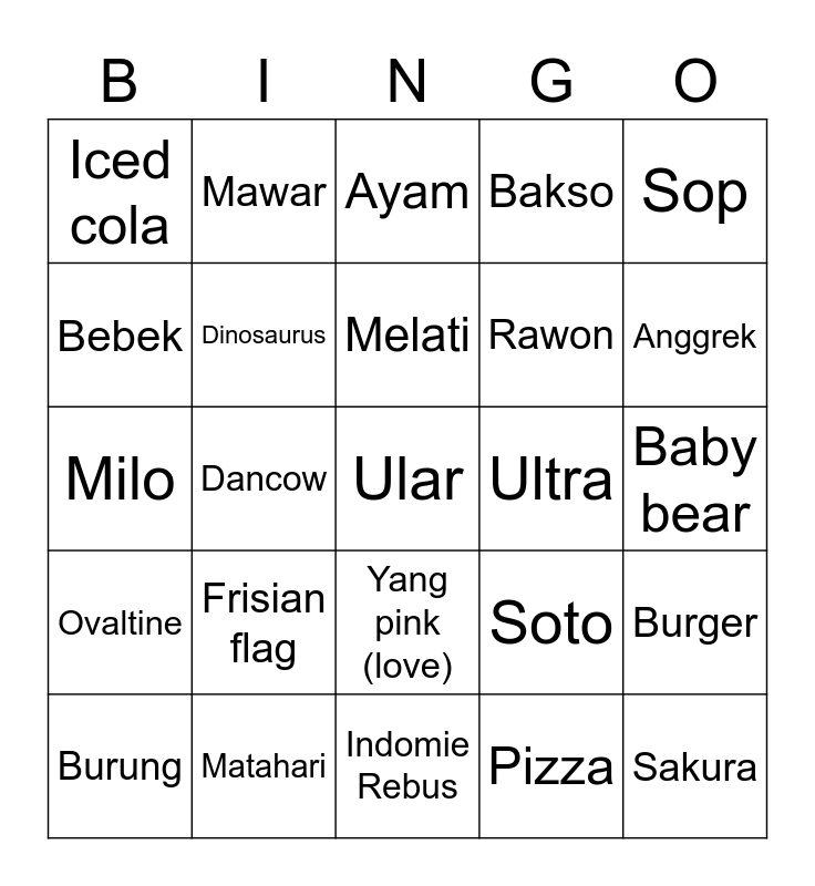 This bingo card has 25 words: Frisian flag, Indomie Rebus, Melati, Burung, Sop, Iced cola, Bebek, Mawar, Ultra, Yang pink (love), Rawon, Milo, Soto, Burger, Dinosaurus, Sakura, Baby bear, Ayam, Anggrek, Dancow, Ular, Matahari, Ovaltine, Bakso and Pizza.
