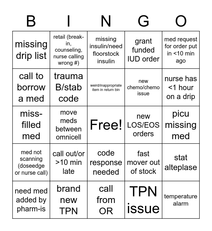 This bingo card has a free space and 42 words: missing lipid/adjust lipid time, weird/inappropriate item in return bin, compatibility question, call out/or >10 min late, TPN issue, stat alteplase, temperature alarm, new crrt/PD, missing insulin/need floorstock insulin, code response needed, picu missing med, nurse has <1 hour on a drip, move meds between omnicell, med request for order put in <10 min ago, need med from central or nurse requesting item that comes from central, fast mover out of stock, tube station down, miss-filled med, page on call, retail (break-in, counseling, nurse calling wrong #), call to borrow a med, forgot ab med in hazard room, med message requesting drug in omnicell, missing drip list, expired med or compound, smog compound, new chemo/chemo issue, premix station with >5 to prep, page or call NNP, rec from a consult service, omnicell discrepancy, med not scanning (doseedge or nurse call), trauma B/stab code, call from OR, new DKA bags STAT, need med added by pharm-is, brand new TPN, new LOS/EOS orders, call from outside pharm to borrow med from SJCH, Nxstage bag bust, grant funded IUD order and need to recon med.