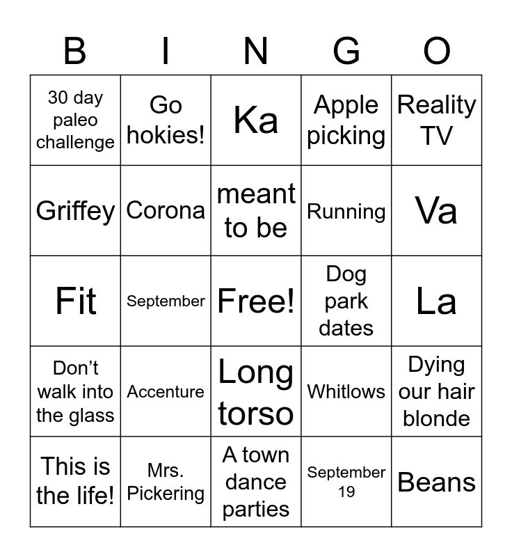 This bingo card has a free space and 29 words: This is the life!, Bear, September, Alex, 30 day paleo challenge, Ka, Corona, Accenture, Dog park dates, Mrs. Pickering, La, Beans, A town dance parties, September 19, Va, Chocolate, Long torso, Don’t walk into the glass, Reality TV, Fit, Whitlows, The long Lost car keys, Running, Griffey, Apple picking, Go hokies!, Dying our hair blonde, meant to be and caps finally got a cup!.