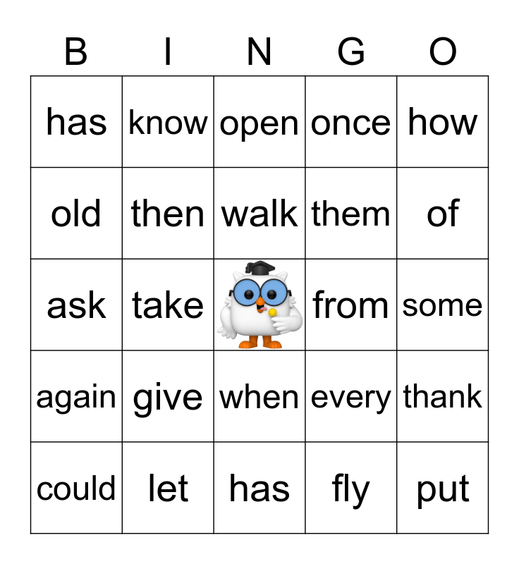 This bingo card has a free space and 24 words: give, let, walk, could, how, has, old, know, from, when, them, ask, every, thank, then, fly, some, open, of, take, put, again, once and has.
