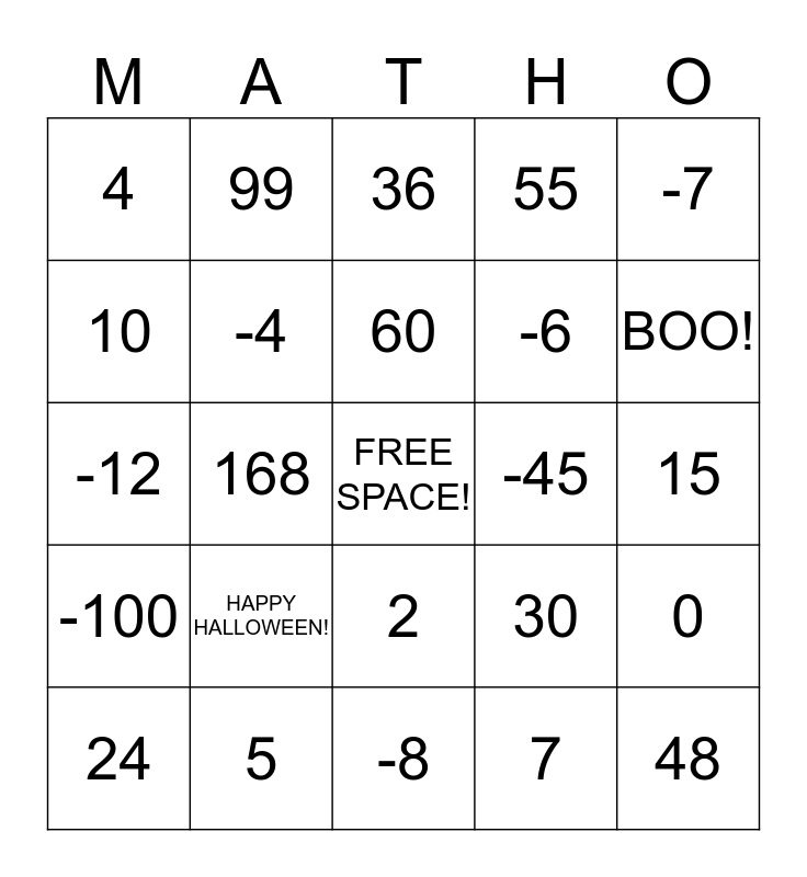 This bingo card has a free space and 24 words: HAPPY HALLOWEEN!, 5, 60, 24, -7, 4, 10, 99, -45, 2, -6, -12, 30, 0, -4, 7, 15, 36, BOO!, 168, 48, -100, 55 and -8.