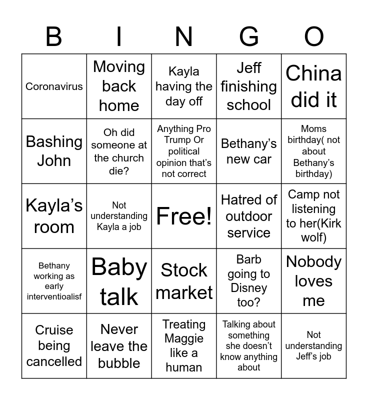 This bingo card has a free space and 24 words: Baby talk, Never leave the bubble, Anything Pro Trump Or political opinion that’s not correct, Cruise being cancelled, China did it, Coronavirus, Bashing John, Moving back home, Hatred of outdoor service, Stock market, Bethany’s new car, Kayla’s room, Barb going to Disney too?, Nobody loves me, Oh did someone at the church die?, Talking about something she doesn’t know anything about, Camp not listening to her(Kirk wolf), Kayla having the day off, Moms birthday( not about Bethany’s birthday), Not understanding Kayla a job, Not understanding Jeff’s job, Bethany working as early interventioalisf, Jeff finishing school and Treating Maggie like a human.