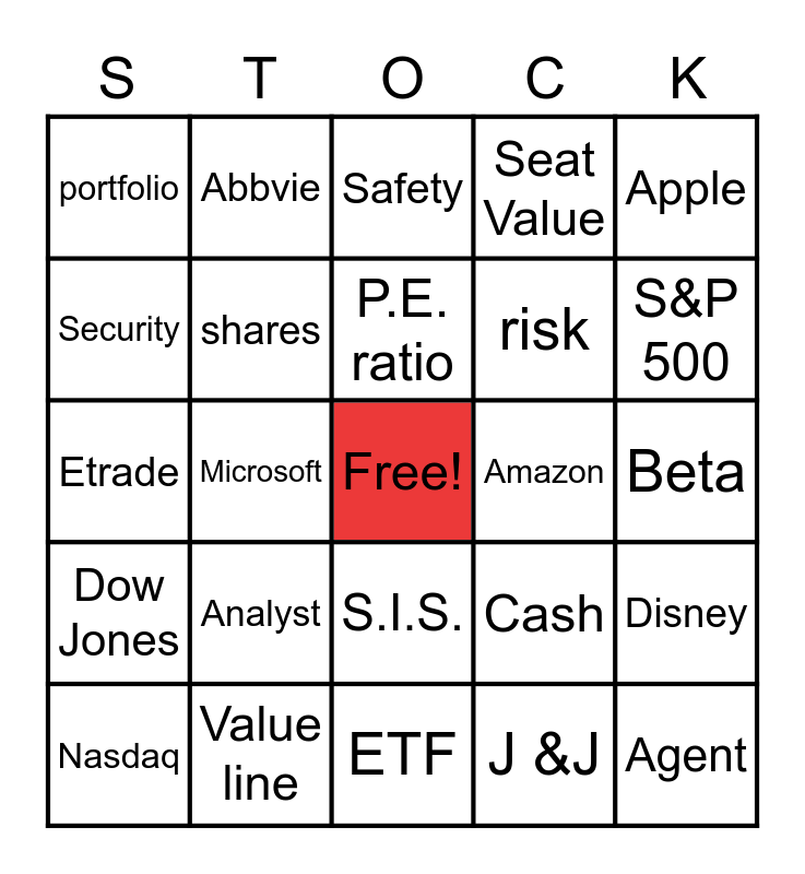 This bingo card has a free space and 28 words: dividend, Value line, P.E. ratio, J &J, Apple, portfolio, shares, ETF, Amazon, Disney, Etrade, Microsoft, Cash, Agent, Security, Buy/Sell, S.I.S., Seat Value, S&P 500, Nasdaq, Abbvie, Investor, risk, Beta, Dow Jones, Analyst, Safety and Bull Market.