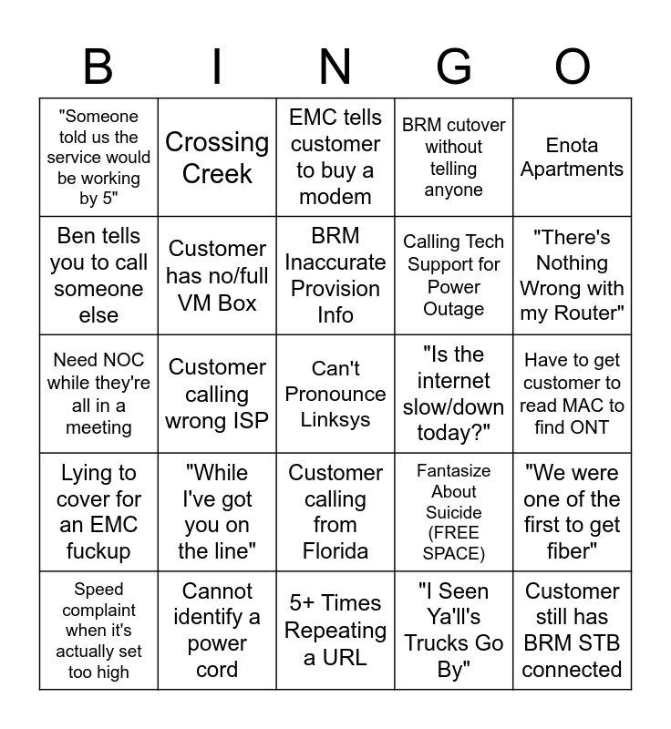 This bingo card has 25 words: "While I've got you on the line", 5+ Times Repeating a URL, BRM Inaccurate Provision Info, Speed complaint when it's actually set too high, Enota Apartments, "Someone told us the service would be working by 5", Ben tells you to call someone else, Crossing Creek, "Is the internet slow/down today?", Customer calling from Florida, Calling Tech Support for Power Outage, Need NOC while they're all in a meeting, Fantasize About Suicide (FREE SPACE), "We were one of the first to get fiber", Customer has no/full VM Box, Customer still has BRM STB connected, Have to get customer to read MAC to find ONT, EMC tells customer to buy a modem, "There's Nothing Wrong with my Router", Customer calling wrong ISP, Can't Pronounce Linksys, Cannot identify a power cord, Lying to cover for an EMC fuckup, BRM cutover without telling anyone and "I Seen Ya'll's Trucks Go By".