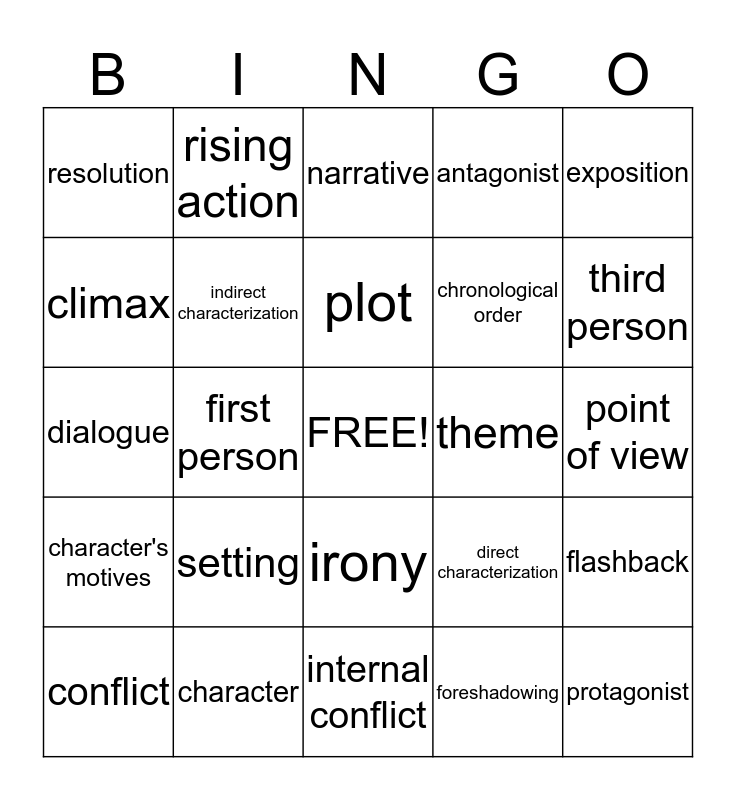 This bingo card has a free space and 24 words: setting, character, plot, conflict, exposition, resolution, climax, rising action, theme, irony, chronological order, dialogue, direct characterization, flashback, indirect characterization, foreshadowing, point of view, narrative, third person, first person, protagonist, character's motives, antagonist and internal conflict.