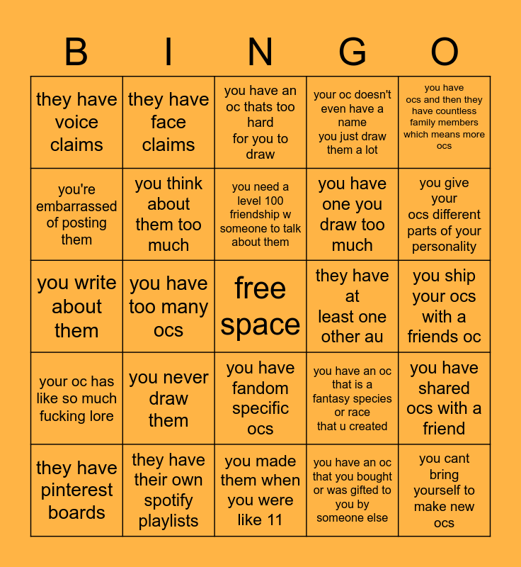This bingo card has a free space and 24 words: you never draw them, they have their own spotify playlists, you need a level 100 friendship w someone to talk about them, they have pinterest boards, you have ocs and then they have countless family members which means more ocs, they have voice claims, you're embarrassed of posting them, they have face claims, they have at least one other au, you have fandom specific ocs, you have one you draw too much, you write about them, you have an oc that is a fantasy species or race that u created, you have shared ocs with a friend, you think about them too much, you have an oc that you bought or was gifted to you by someone else, you ship your ocs with a friends oc, you have an oc thats too hard for you to draw, you give your ocs different parts of your personality, you have too many ocs, you cant bring yourself to make new ocs, your oc has like so much fucking lore, your oc doesn't even have a name you just draw them a lot and you made them when you were like 11.