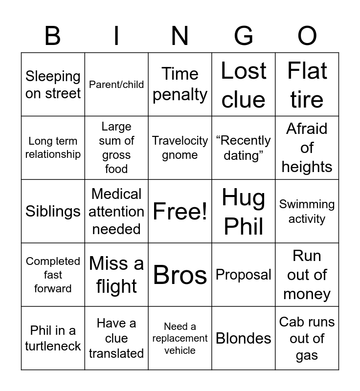 This bingo card has a free space and 36 words: India, Camel activity, Phil fakeout, Large sum of gross food, Proposal, Completed fast forward, Travelocity gnome, Uturn used, Flat tire, Can’t drive stick shift, Medical attention needed, Lost clue, Handling livestock, Hug Phil, Afraid of heights, Sleeping on street, Production in the shot, Miss a flight, Cab runs out of gas, Time penalty, Swimming activity, Run out of money, Have a clue translated, Phil in a turtleneck, Need a replacement vehicle, Parent/child, Siblings, Dating, “Recently dating”, Long term relationship, Older couple, LGBTQ+ couple, Blondes, Bros, Not done racing leg and “Abduct” a local.