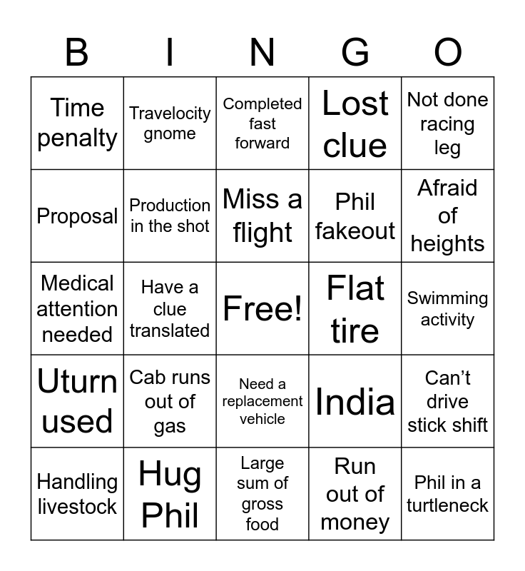 This bingo card has a free space and 27 words: India, Camel activity, Phil fakeout, Large sum of gross food, Proposal, Completed fast forward, Travelocity gnome, Uturn used, Flat tire, Can’t drive stick shift, Medical attention needed, Lost clue, Handling livestock, Hug Phil, Afraid of heights, Sleeping on street, Production in the shot, Miss a flight, Cab runs out of gas, Time penalty, Swimming activity, Run out of money, Have a clue translated, Phil in a turtleneck, Need a replacement vehicle, Not done racing leg and “Abduct” a local.