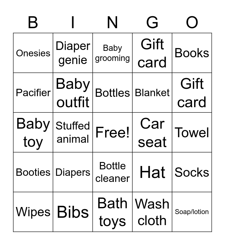 This bingo card has a free space and 24 words: Diapers, Bibs, Bottles, Wipes, Books, Onesies, Pacifier, Diaper genie, Car seat, Bottle cleaner, Blanket, Baby toy, Hat, Socks, Baby outfit, Wash cloth, Towel, Baby grooming, Gift card, Stuffed animal, Soap/lotion, Booties, Gift card and Bath toys.