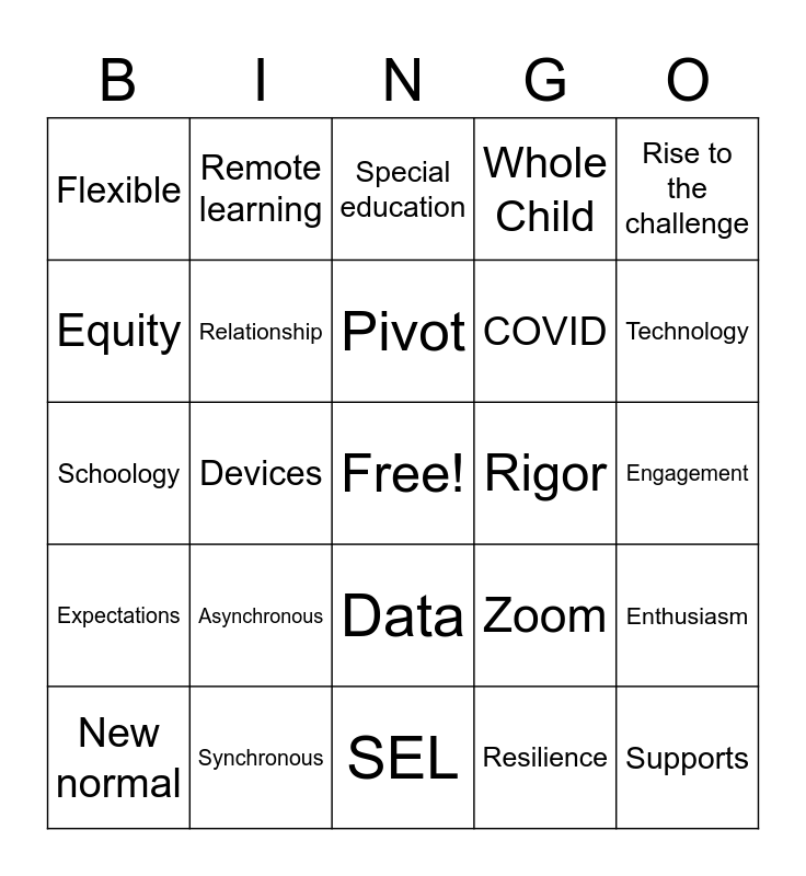 This bingo card has a free space and 24 words: Asynchronous, Synchronous, Pivot, New normal, Rise to the challenge, Flexible, Equity, Remote learning, Rigor, Data, COVID, Schoology, Zoom, Enthusiasm, Relationship, Resilience, Engagement, Special education, Technology, Devices, Supports, Expectations, Whole Child and SEL.