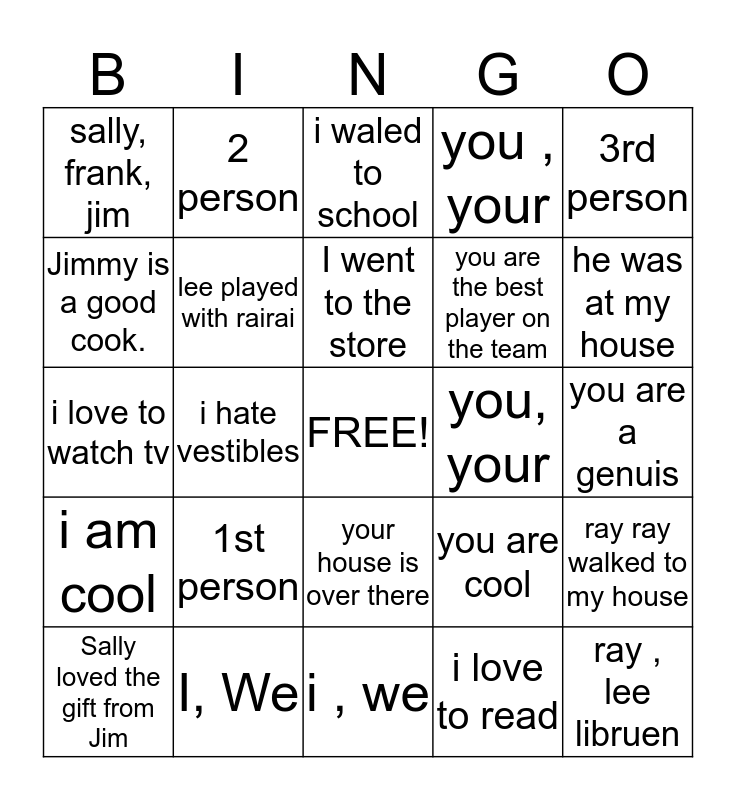 This bingo card has a free space and 24 words: 1st person, I, We, I went to the store, Sally loved the gift from Jim, 3rd person, sally, frank, jim, Jimmy is a good cook., 2 person, you, your, your house is over there, you are the best player on the team, i love to watch tv, you are cool, ray ray walked to my house, lee played with rairai, i love to read, you are a genuis, i waled to school, he was at my house, i hate vestibles, ray , lee libruen, i am cool, you , your and i , we.