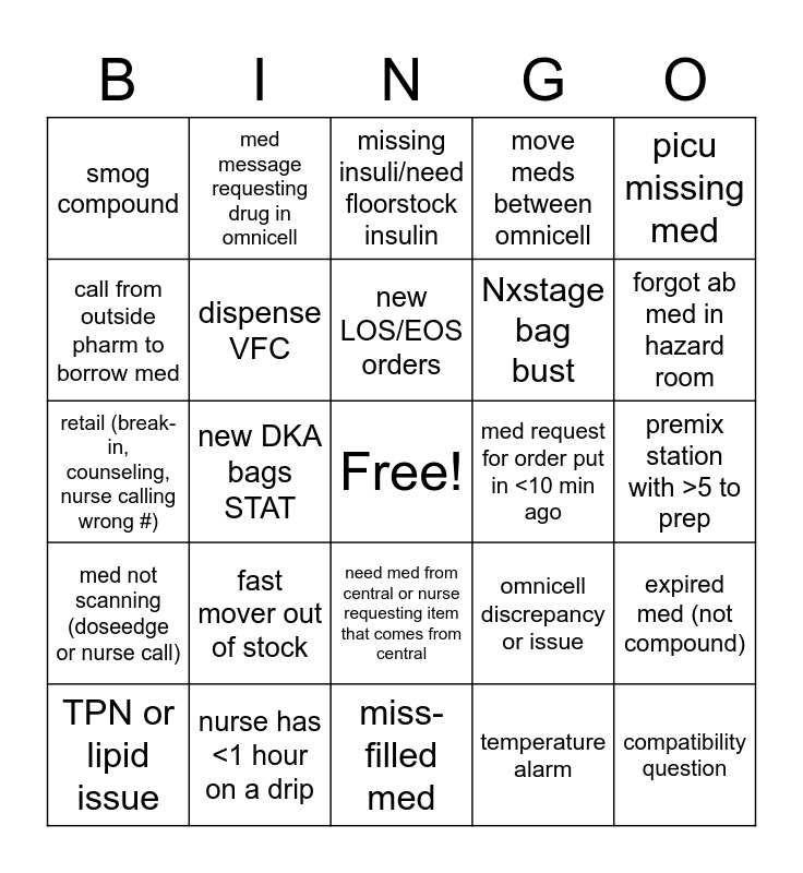 This bingo card has a free space and 43 words: weird/inappropriate item in return bin, compatibility question, call out/or >10 min late, TPN or lipid issue, stat alteplase, temperature alarm, missing insuli/need floorstock insulin, code response needed, picu missing med, nurse has <1 hour on a drip, move meds between omnicell, med request for order put in <10 min ago, need med from central or nurse requesting item that comes from central, fast mover out of stock, tube station down, miss-filled med, page on call, retail (break-in, counseling, nurse calling wrong #), call to borrow a med, forgot ab med in hazard room, med message requesting drug in omnicell, missing drip list, expired compound, smog compound, new chemo/chemo issue, premix station with >5 to prep, page or call NNP, rec from a consult service, omnicell discrepancy or issue, med not scanning (doseedge or nurse call), trauma B/stab code, expired med (not compound), call from OR, new DKA bags STAT, calling maintenance or environmental services, need med added by pharm-is, brand new TPN, new LOS/EOS orders, call from outside pharm to borrow med, Nxstage bag bust, recon med, dispense VFC and STAT med cannot be tubed.