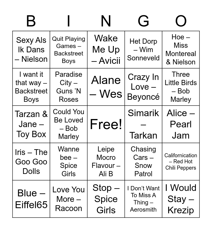This bingo card has a free space and 25 words: Wanne bee – Spice Girls, Stop – Spice Girls, Alane – Wes, Blue – Eiffel65, Hoe – Miss Montereal & Nielson, Sexy Als Ik Dans – Nielson, I want it that way – Backstreet Boys, Quit Playing Games – Backstreet Boys, Simarik – Tarkan, Leipe Mocro Flavour – Ali B, Crazy In Love – Beyoncé, Tarzan & Jane – Toy Box, Chasing Cars – Snow Patrol, Californication – Red Hot Chili Peppers, Paradise City – Guns ’N Roses, Ice Queen – Wthin Temptation, Alice – Pearl Jam, Wake Me Up – Avicii, Three Little Birds – Bob Marley, Could You Be Loved – Bob Marley, I Would Stay – Krezip, Love You More – Racoon, Iris – The Goo Goo Dolls, Het Dorp – Wim Sonneveld and I Don’t Want To Miss A Thing – Aerosmith.