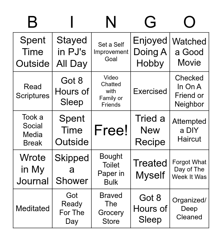 This bingo card has a free space and 24 words: Skipped a Shower, Got Ready For The Day, Video Chatted with Family or Friends, Meditated, Watched a Good Movie, Spent Time Outside, Read Scriptures, Stayed in PJ's All Day, Tried a New Recipe, Bought Toilet Paper in Bulk, Exercised, Took a Social Media Break, Treated Myself, Forgot What Day of The Week It Was, Got 8 Hours of Sleep, Got 8 Hours of Sleep, Attempted a DIY Haircut, Set a Self Improvement Goal, Checked In On A Friend or Neighbor, Spent Time Outside, Organized/ Deep Cleaned, Wrote in My Journal, Enjoyed Doing A Hobby and Braved The Grocery Store.