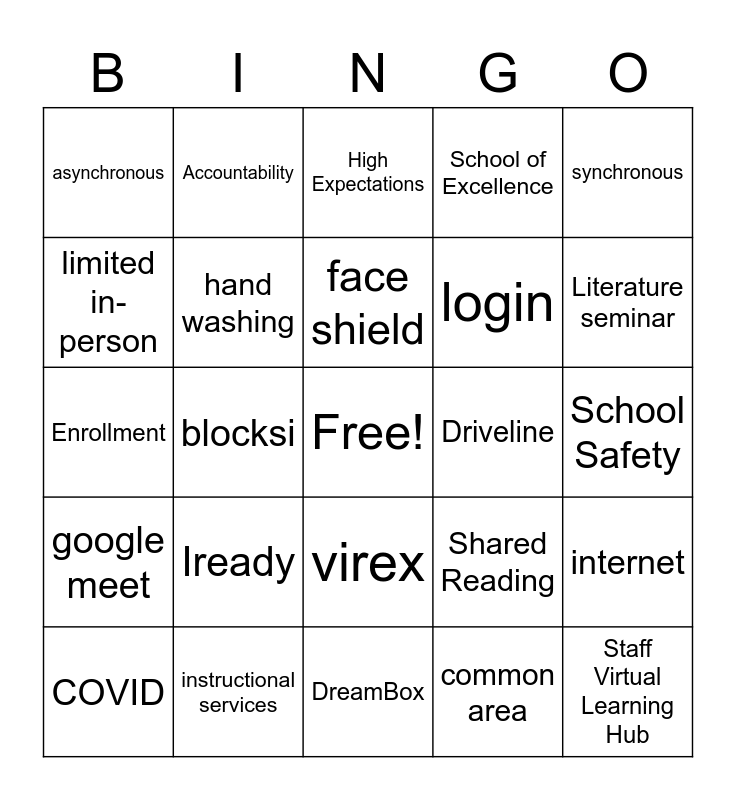 This bingo card has a free space and 31 words: COVID, social distancing, face shield, mask, synchronous, asynchronous, hand washing, virex, login, google classroom, google meet, blocksi, plexiglass shield, common area, internet, trash, Iready, DreamBox, Driveline, Staff Virtual Learning Hub, limited in-person, instructional services, remote, School of Excellence, School Safety, Enrollment, Accountability, High Expectations, Shared Reading, Literature seminar and Bridges intervention.
