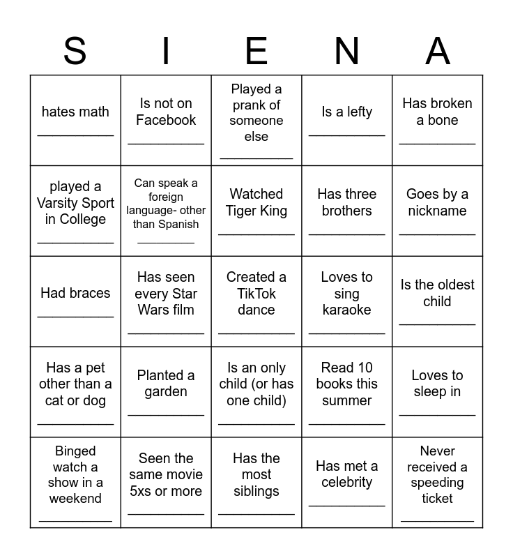 This bingo card has 35 words: Has a birthday this month __________, Can play an instrument __________, Has a tattoo __________, Can speak a foreign language- other than Spanish _________, Is an only child (or has one child) __________, Is a lefty __________, played a Varsity Sport in College __________, watches reality TV __________, Watched Tiger King __________, Ran a marathon __________, Had braces __________, Has broken a bone __________, Created a bitmoji classroom _______, Has lived in another country __________, hates math __________, Loves to sing karaoke __________, Has met a celebrity __________, Has seen every Star Wars film __________, Has a pet other than a cat or dog __________, Created a TikTok dance __________, Read 10 books this summer __________, Binged watch a show in a weekend __________, Loves to sleep in __________, Seen the same movie 5xs or more __________, Played a prank of someone else __________, Goes by a nickname __________, Never received a speeding ticket __________, Doesn't drink coffee __________, Has three brothers __________, Is the oldest child __________, Has read all of the Harry Potter books __________, Has the most siblings __________, Planted a garden __________, Is not on Facebook __________ and Works from home __________.