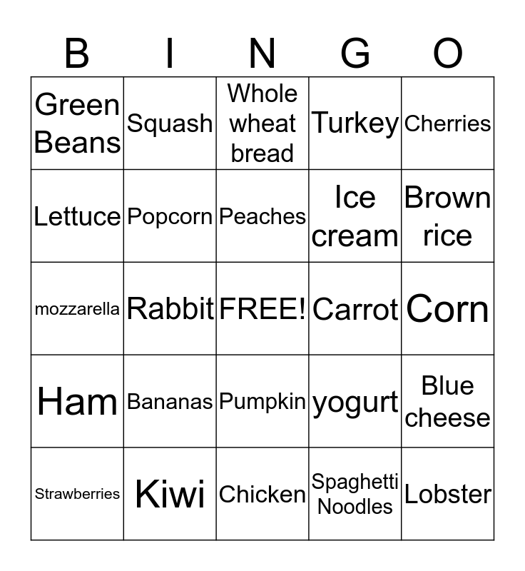 This bingo card has a free space and 24 words: Bananas, Kiwi, Peaches, Strawberries, Cherries, Green Beans, Lettuce, Squash, Carrot, Pumpkin, Ice cream, mozzarella, yogurt, Blue cheese, Popcorn, Spaghetti Noodles, Corn, Whole wheat bread, Brown rice, Rabbit, Lobster, Ham, Turkey and Chicken.