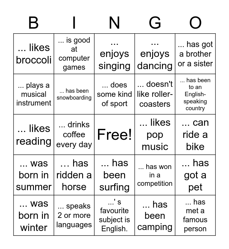 This bingo card has a free space and 24 words: … has ridden a horse, ... speaks 2 or more languages, ... does some kind of sport, ... was born in winter, ... has got a brother or a sister, ... likes broccoli, ... plays a musical instrument, ... is good at computer games, ... likes pop music, ... has been surfing, ... doesn't like roller-coasters, ... likes reading, ... has won in a competition, ... has got a pet, ... has been snowboarding, ... has been camping, ... can ride a bike, ... enjoys singing, ... has been to an English-speaking country, ... drinks coffee every day, ... has met a famous person, ... was born in summer, ... enjoys dancing and ...' s favourite subject is English..