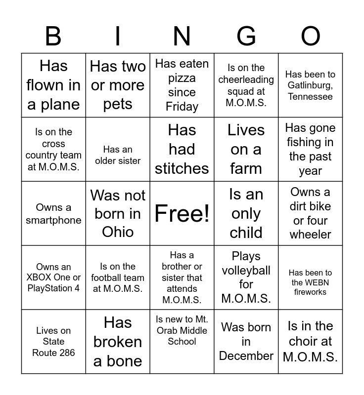 This bingo card has a free space and 31 words: Is new to Mt. Orab Middle School, Has seen a movie in the theater in the past week, Was not born in Ohio, Has read a Harry Potter book, Has flown in a plane, Has eaten pizza since Friday, Has an older sister, Plays volleyball for M.O.M.S., Is an only child, Was born in December, Owns a dirt bike or four wheeler, Is in the choir at M.O.M.S., Is allergic to peanuts, Has a pet hamster, Has gone fishing in the past year, Is in the band at M.O.M.S., Has been to the WEBN fireworks, Is on the football team at M.O.M.S., Owns an XBOX One or PlayStation 4, Has a brother or sister that attends M.O.M.S., Has been to Gatlinburg, Tennessee, Owns a skateboard, Lives on State Route 286, Has two or more pets, Lives on a farm, Is on the cross country team at M.O.M.S., Is on the cheerleading squad at M.O.M.S., Owns a smartphone, Has broken a bone, Has had stitches and Attended a professional baseball game.