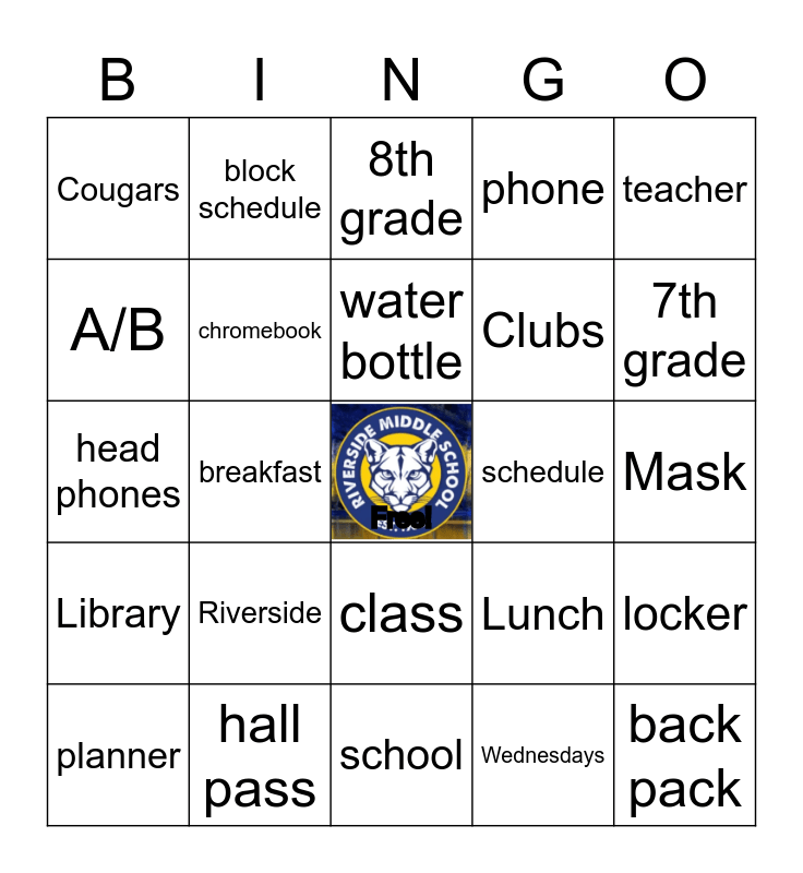This bingo card has a free space and 24 words: Riverside, hall pass, water bottle, planner, teacher, Cougars, A/B, block schedule, schedule, class, Clubs, head phones, Lunch, locker, chromebook, Wednesdays, Mask, 8th grade, 7th grade, breakfast, back pack, Library, phone and school.