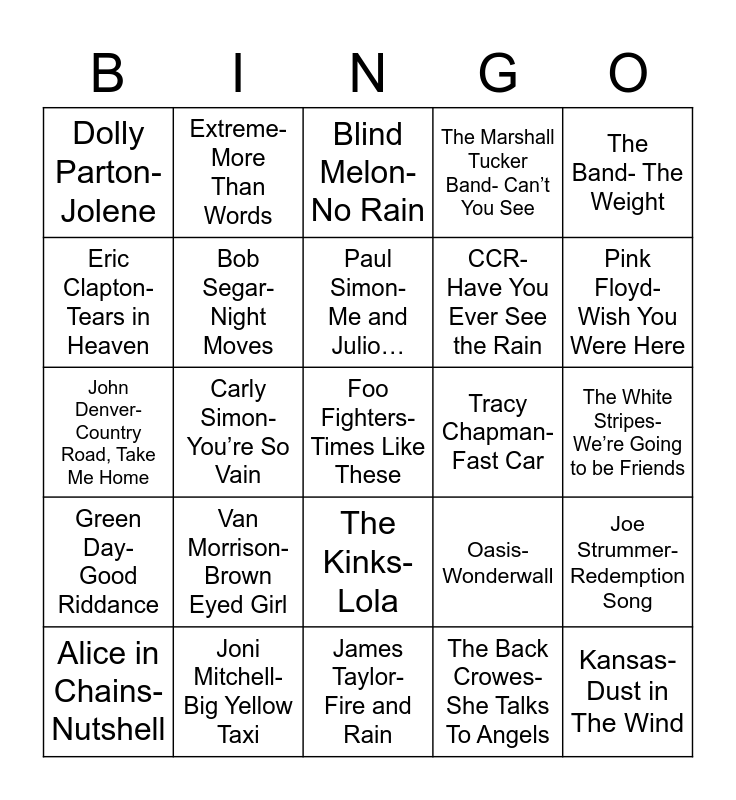 This bingo card has 27 words: Oasis- Wonderwall, Kansas- Dust in The Wind, CCR- Have You Ever See the Rain, James Taylor- Fire and Rain, Eric Clapton- Tears in Heaven, Blind Melon- No Rain, Extreme- More Than Words, Green Day- Good Riddance, Tracy Chapman- Fast Car, Joe Strummer- Redemption Song, John Denver- Country Road, Take Me Home, The Marshall Tucker Band- Can’t You See, Alice in Chains- Nutshell, Joni Mitchell- Big Yellow Taxi, Pink Floyd- Wish You Were Here, Nirvana- Something in the Way, Bob Segar- Night Moves, Paul Simon- Me and Julio…, Van Morrison- Brown Eyed Girl, Dolly Parton- Jolene, The White Stripes- We’re Going to be Friends, The Back Crowes- She Talks To Angels, Carly Simon- You’re So Vain, Foo Fighters- Times Like These, The Kinks- Lola, The Band- The Weight and Incubus- Drive.