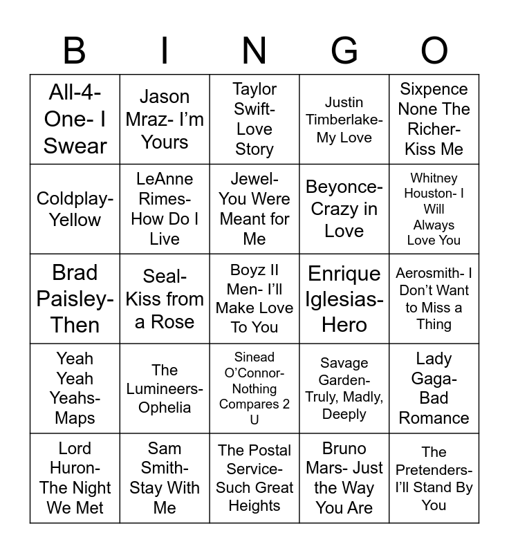 This bingo card has 28 words: Lady Gaga- Bad Romance, Ed Sheeran- Thinking Out Loud, Beyonce- Crazy in Love, Bruno Mars- Just the Way You Are, Coldplay- Yellow, Taylor Swift- Love Story, Jason Mraz- I’m Yours, Yeah Yeah Yeahs- Maps, Enrique Iglesias- Hero, Lord Huron- The Night We Met, Brad Paisley- Then, Justin Timberlake- My Love, Sam Smith- Stay With Me, The Postal Service- Such Great Heights, Whitney Houston- I Will Always Love You, Rascal Flatts- Bless the Broken Road, The Lumineers- Ophelia, LeAnne Rimes- How Do I Live, Jewel- You Were Meant for Me, Sinead O’Connor- Nothing Compares 2 U, All-4-One- I Swear, The Pretenders- I’ll Stand By You, Boyz II Men- I’ll Make Love To You, Seal- Kiss from a Rose, Aerosmith- I Don’t Want to Miss a Thing, Savage Garden- Truly, Madly, Deeply, Sixpence None The Richer- Kiss Me and Elton John- Can You Feel the Love Tonight?.