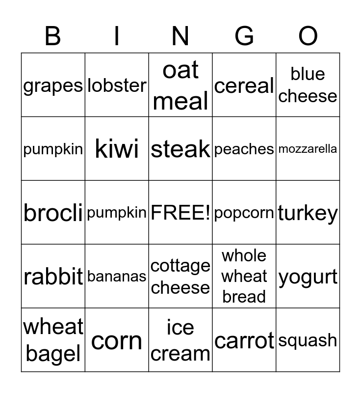 This bingo card has a free space and 24 words: bananas, corn, steak, wheat bagel, blue cheese, grapes, pumpkin, lobster, popcorn, cottage cheese, peaches, brocli, whole wheat bread, yogurt, kiwi, carrot, turkey, oat meal, mozzarella, pumpkin, squash, rabbit, cereal and ice cream.