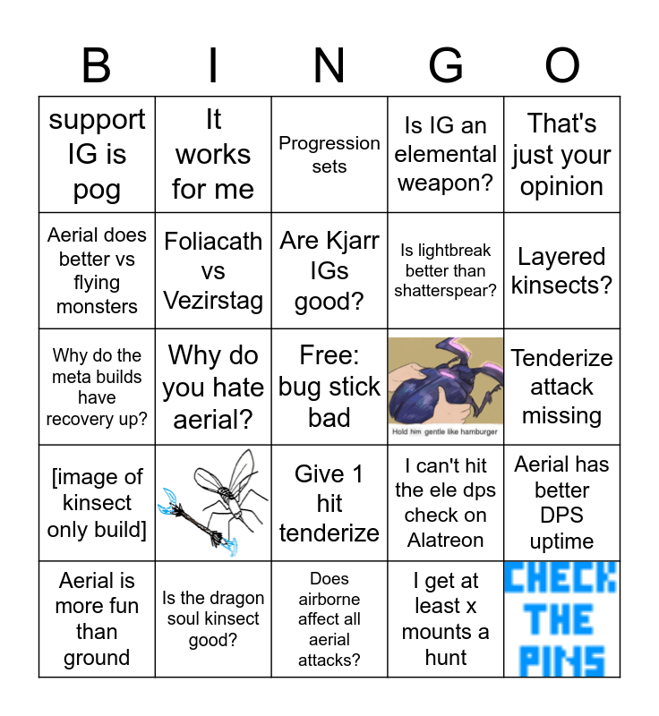 This bingo card has 3 images, a free space and 21 words: Is the dragon soul kinsect good?, Are Kjarr IGs good?, Aerial is more fun than ground, That's just your opinion, support IG is pog, Aerial does better vs flying monsters, It works for me, Give 1 hit tenderize, Is lightbreak better than shatterspear?, Why do the meta builds have recovery up?, I can't hit the ele dps check on Alatreon, Aerial has better DPS uptime, Foliacath vs Vezirstag, I get at least x mounts a hunt, Tenderize attack missing, Progression sets, Layered kinsects?, Why do you hate aerial?, [image of kinsect only build], Is IG an elemental weapon? and Does airborne affect all aerial attacks?.
