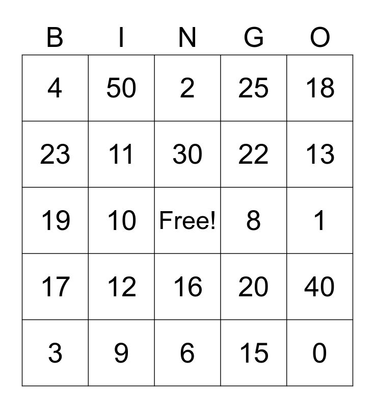 This bingo card has a free space and 29 words: 3, 7, 10, 5, 4, 2, 11, 12, 8, 9, 1, 0, 6, 15, 13, 14, 16, 17, 18, 19, 20, 21, 22, 23, 25, 50, 40, 30 and 60.