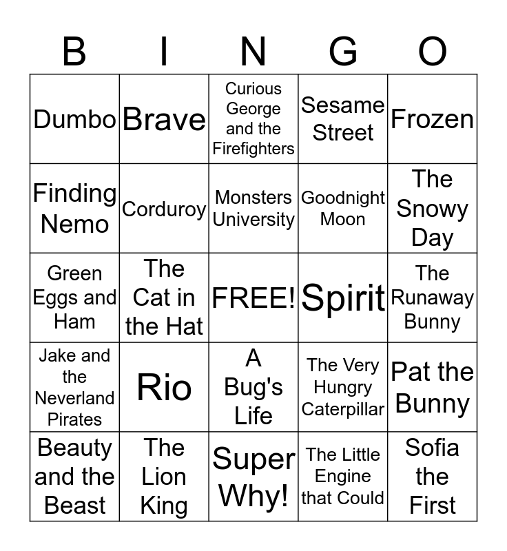This bingo card has a free space and 24 words: Rio, The Lion King, Monsters University, Beauty and the Beast, Frozen, Dumbo, Finding Nemo, Brave, Spirit, A Bug's Life, Goodnight Moon, Green Eggs and Ham, The Very Hungry Caterpillar, Pat the Bunny, Corduroy, The Little Engine that Could, The Runaway Bunny, Curious George and the Firefighters, The Snowy Day, The Cat in the Hat, Sofia the First, Jake and the Neverland Pirates, Sesame Street and Super Why!.