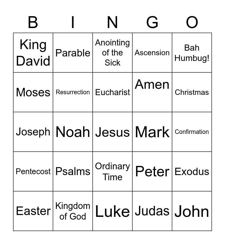 This bingo card has a free space and 48 words: John the Baptist, John, Pilate, Luke, Psalms, Genesis, Parable, Beatitudes, Moses, Crucifixion, Resurrection, Ascension, Exodus, Peter, Trinity, Matthew, Eucharist, Mark, Jerusalem, Bah Humbug!, Noah, Judas, King David, Amen, Lent, Christmas, Easter, Advent, Ordinary Time, Pentecost, All Saints, Francis I, Sin, Mary, Kingdom of God, Ten Commandments, Golden Rule, Confirmation, Holy Orders, Marriage, Baptism, Reconciliation, Anointing of the Sick, Abraham, Joseph, St. Michael, The Last Supper and Heaven.