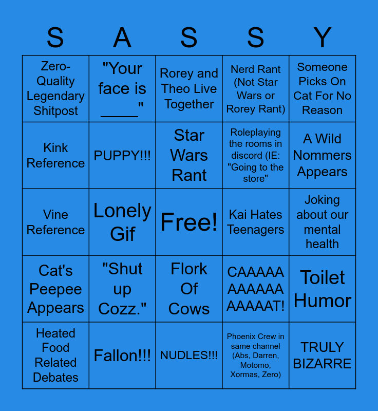 This bingo card has a free space and 49 words: Panda, TRULY BIZARRE, Gif War, NUDLES!!!, "Shut up Cozz.", TAFFER!!!, "Your face is ____", Salty Quote, Kink Reference, Rorey Rant, PUPPY!!!, Nerd Rant (Not Star Wars or Rorey Rant), Toilet Humor, CAAAAA AAAAAA AAAAAT!, Fashion Wars, Carly Car Ride Convo, Star Wars Rant, Kai Hates Teenagers, Theo's Weird Food Tastes, Someone Picks On Cat For No Reason, Lonely Gif, Phoenix Crew in same channel (Abs, Darren, Motomo, Xormas, Zero), Zero-Quality Legendary Shitpost, Roleplaying the rooms in discord (IE: "Going to the store", DUBYA, A Wild Nommers Appears, Heated Food Related Debates, Gurjeet Does Something Adorable, Flork Of Cows, Cat's Peepee Appears, Someone Gushes About their Significant Other, Spookums causes a jumpscare in multiple people (3+), Xormas's Legendary Comebacks, Mommabear Rorey being Mommabear Rorey, Fallon!!!, *Raspberry Noises*, *Fart Noises*, Its not a gnoblin, Joking about our mental health, Silverah Misses Gw2, Patchbot Spams Ark (3+ Posts), Spookums is actually spooky, "I love you guys", Toilet Humor, Vine Reference, Rorey and Theo Live Together, Movie Night, Innuendo and UwU.