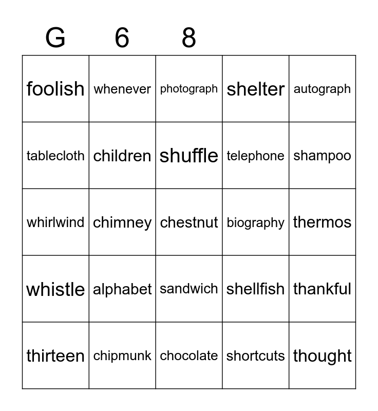 This bingo card has a free space and 24 words: alphabet, chipmunk, shuffle, thirteen, autograph, foolish, tablecloth, whenever, biography, sandwich, telephone, whirlwind, shellfish, thankful, children, shortcuts, thermos, photograph, shampoo, chimney, thought, whistle, shelter and chocolate.