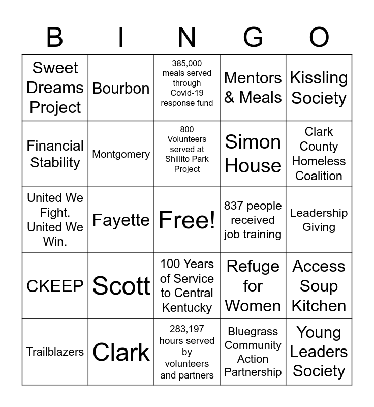 This bingo card has a free space and 49 words: 211, Anderson, Doves of Gateway, Bluegrass Community Action Partnership, Leadership Giving, Education, Bourbon, Telford YMCA, Simon House, Women United, Financial Stability, Fayette, Refuge for Women, Young Leaders Society, Basic Needs, Franklin, 385,000 meals served through Covid-19 response fund, 837 people received job training, Tocqueville Society, Sweet Dreams Project, Clark, 283,197 hours served by volunteers and partners, Mentors & Meals, Kissling Society, Way Point Centers, Scott, 800 Volunteers served at Shillito Park Project, 61 Agency Partners, Access Soup Kitchen, CKEEP, Woodford, 100 Years of Service to Central Kentucky, 83 Programs Funded, Jubilee Jobs of Lexington, Trailblazers, Jessamine, Volunteer, 10 Counties, Clark County Homeless Coalition, Covid-19 Response Fund, Madison, Advocate, 117,858 people served, Casa of the Bluegrass, United We Fight. United We Win., Montgomery, Give, 15,596 people served by 211 and Post Clinic.