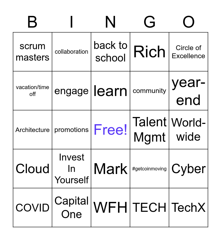 This bingo card has a free space and 28 words: Cyber, zoom, community, TECH, vacation/time off, back to school, collaboration, Cloud, Talent Mgmt, COVID, Architecture, Rich, Capital One, WFH, year-end, CSSE/AWS certification, Invest In Yourself, engage, learn, Mark, scrum masters, DIB (Diversity, Inclusion & Belonging), TechX, promotions, World-wide, #getcoinmoving, Circle of Excellence and BRGs.