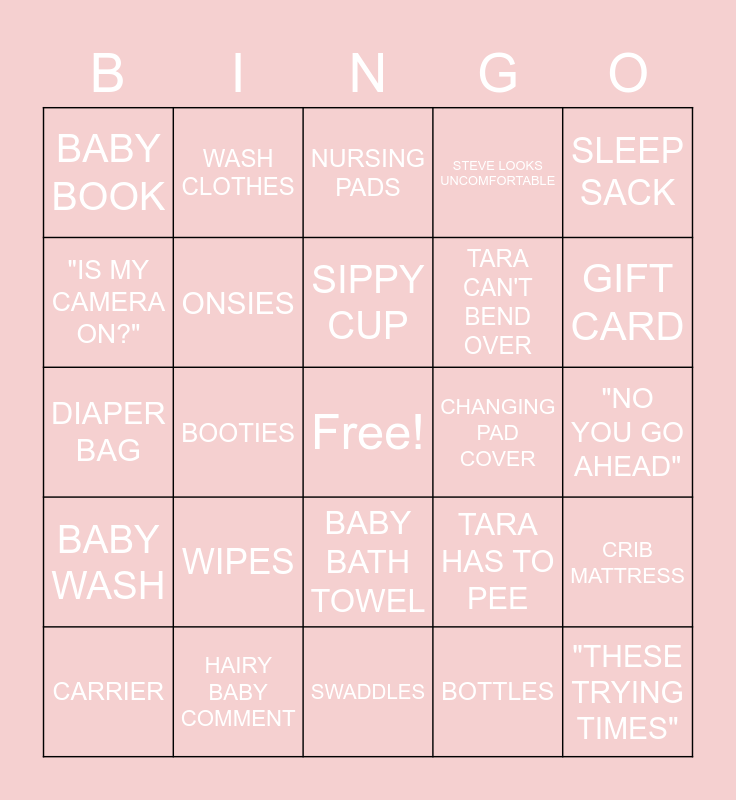 This bingo card has a free space and 32 words: BOTTLES, PACIFIER, BOOTIES, DIAPERS, BABY WASH, ONSIES, SLEEP SACK, CRIB MATTRESS, WASH CLOTHES, DIAPER RASH CREAM, SIPPY CUP, NURSING PADS, BREAST PUMP, BASSINET, CHANGING PAD COVER, CRIB SHEETS, CARRIER, DIAPER BAG, BABY BATH TOWEL, WIPES, TARA HAS TO PEE, "SORRY, WHAT DID YOU SAY?", "NO YOU GO AHEAD", HAIRY BABY COMMENT, "THESE TRYING TIMES", STEVE LOOKS UNCOMFORTABLE, TARA CAN'T BEND OVER, "IS MY CAMERA ON?", BABY BOOK, SWADDLES, STUFFED ANIMALS and GIFT CARD.