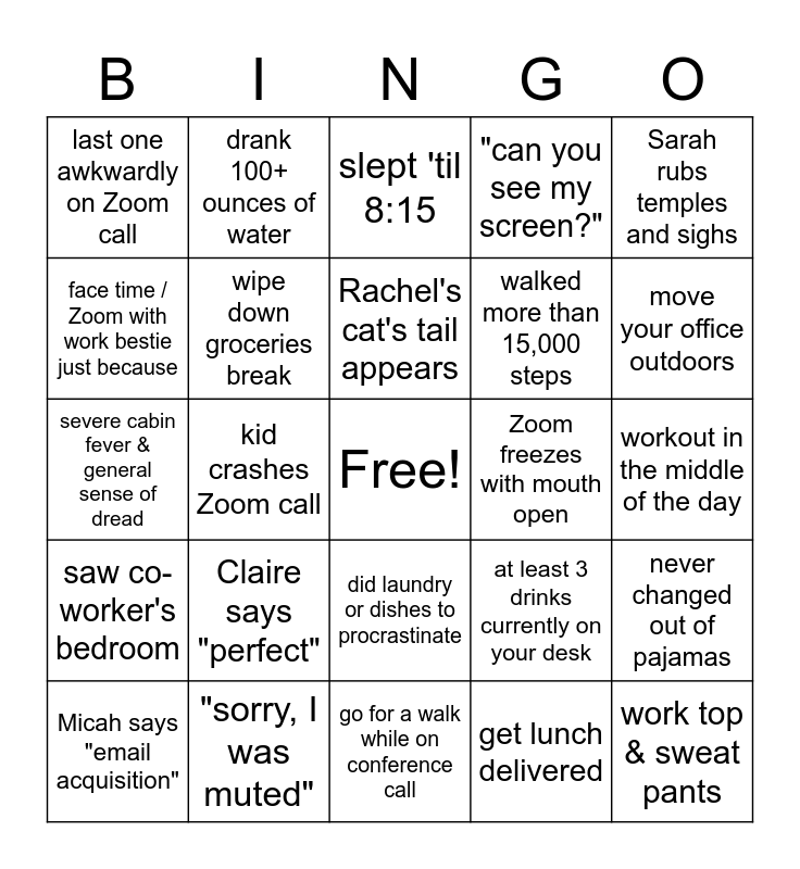 This bingo card has a free space and 30 words: "sorry, I was muted", dropped VPN, kid crashes Zoom call, pet demands attention, last one awkwardly on Zoom call, slept 'til 8:15, wipe down groceries break, did laundry or dishes to procrastinate, Zoom freezes with mouth open, go for a walk while on conference call, workout in the middle of the day, work top & sweat pants, get lunch delivered, bad quarantine hair (and don't care), move your office outdoors, dessert for breakfast, at least 3 drinks currently on your desk, saw co-worker's bedroom, Claire says "perfect", Sarah rubs temples and sighs, severe cabin fever & general sense of dread, roll your eyes or argue with at-home office mate, spouse, or roommate, drank 100+ ounces of water, walked more than 15,000 steps, face time / Zoom with work bestie just because, "can you see my screen?", never changed out of pajamas, Micah says "email acquisition", Rachel's cat's tail appears and Megan drinks coffee after 3pm.
