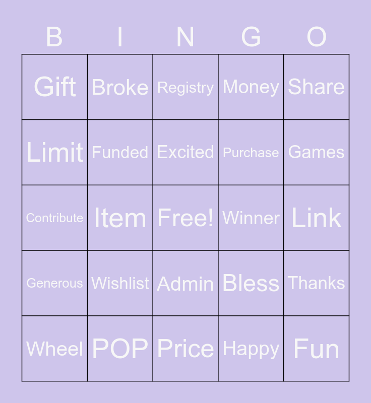 This bingo card has a free space and 29 words: Wheel, Ninja, Item, Giving, Gift, Registry, Funded, Wishlist, Winner, POP, Link, Fun, Price, Happy, Games, Amazon, Admin, Generous, Share, Contribute, Bless, Addiction, Purchase, Limit, Money, Broke, Thanks, Excited and Caring.