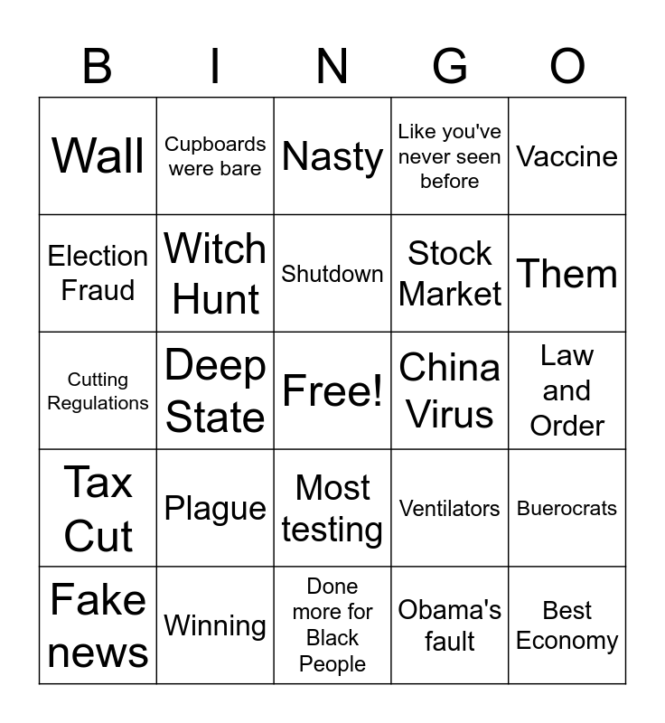 This bingo card has a free space and 29 words: Fake news, Swamp, Deep State, Invasion, Wall, Nasty, Witch Hunt, Plague, China Virus, Winning, Law and Order, Best Economy, Done more for Black People, Obama's fault, Them, Sleepy Joe, Most testing, Tax Cut, Vaccine, Cutting Regulations, Ventilators, Hoax, Stock Market, Election Fraud, Like you've never seen before, Cupboards were bare, Buerocrats, Shutdown and Portland or Chicago.